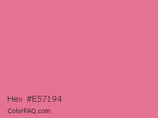 Hex #e57194 Color is a light rose color and the nearest color is Bright Blush #e47698. Hex code #e57194 and RGB value is rgb(229,113,148). In RGB color space, this color is composed of 90% red, 44% green, 58% blue, In CMYK color space, this color is composed of 0% cyan, 51% magenta, 35% yellow , 10% black , In HSL color space, this color has a hue angle of 342° , 69% saturation and 67% lightness.