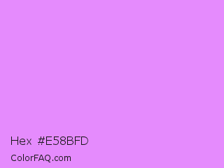 Hex #e58bfd Color is a light purple color and the nearest color is Lavender Magenta #ee82ee. Hex code #e58bfd and RGB value is rgb(229,139,253). In RGB color space, this color is composed of 90% red, 55% green, 99% blue, In CMYK color space, this color is composed of 9% cyan, 45% magenta, 0% yellow , 1% black , In HSL color space, this color has a hue angle of 287° , 97% saturation and 77% lightness.