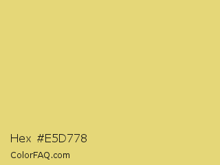 Hex #e5d778 Color is a light yellow color and the nearest color is Straw #e4d96f. Hex code #e5d778 and RGB value is rgb(229,215,120). In RGB color space, this color is composed of 90% red, 84% green, 47% blue, In CMYK color space, this color is composed of 0% cyan, 6% magenta, 48% yellow , 10% black , In HSL color space, this color has a hue angle of 52° , 68% saturation and 68% lightness.