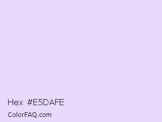 Hex #e5dafe Color is a very light indigo color and the nearest color is Lavender Mist #e6e6fa. Hex code #e5dafe and RGB value is rgb(229,218,254). In RGB color space, this color is composed of 90% red, 85% green, 100% blue, In CMYK color space, this color is composed of 10% cyan, 14% magenta, 0% yellow , 0% black , In HSL color space, this color has a hue angle of 258° , 95% saturation and 93% lightness.