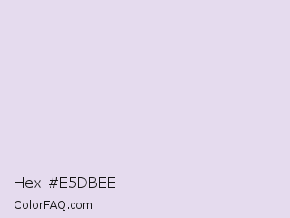 Hex #e5dbee Color is a very light purple color and the nearest color is Snuff #e2d8ed. Hex code #e5dbee and RGB value is rgb(229,219,238). In RGB color space, this color is composed of 90% red, 86% green, 93% blue, In CMYK color space, this color is composed of 4% cyan, 8% magenta, 0% yellow , 7% black , In HSL color space, this color has a hue angle of 272° , 36% saturation and 90% lightness.