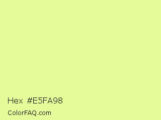 Hex #e5fa98 Color is a light lime color and the nearest color is Jonquil #eeff9a. Hex code #e5fa98 and RGB value is rgb(229,250,152). In RGB color space, this color is composed of 90% red, 98% green, 60% blue, In CMYK color space, this color is composed of 8% cyan, 0% magenta, 39% yellow , 2% black , In HSL color space, this color has a hue angle of 73° , 91% saturation and 79% lightness.