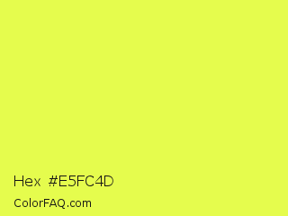 Hex #e5fc4d Color is a light yellow color and the nearest color is Starship #ecf245. Hex code #e5fc4d and RGB value is rgb(229,252,77). In RGB color space, this color is composed of 90% red, 99% green, 30% blue, In CMYK color space, this color is composed of 9% cyan, 0% magenta, 69% yellow , 1% black , In HSL color space, this color has a hue angle of 68° , 97% saturation and 65% lightness.