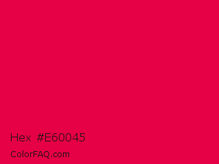 Hex #e60045 Color is a normal rose color and the nearest color is Red Ribbon #ed0a3f. Hex code #e60045 and RGB value is rgb(230,0,69). In RGB color space, this color is composed of 90% red, 0% green, 27% blue, In CMYK color space, this color is composed of 0% cyan, 100% magenta, 70% yellow , 10% black , In HSL color space, this color has a hue angle of 342° , 100% saturation and 45% lightness.