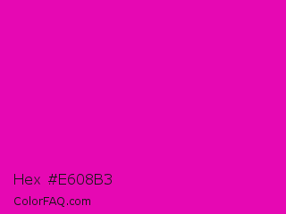 Hex #e608b3 Color is a normal magenta color and the nearest color is Hollywood Cerise #f400a1. Hex code #e608b3 and RGB value is rgb(230,8,179). In RGB color space, this color is composed of 90% red, 3% green, 70% blue, In CMYK color space, this color is composed of 0% cyan, 97% magenta, 22% yellow , 10% black , In HSL color space, this color has a hue angle of 314° , 93% saturation and 47% lightness.