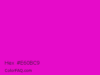 Hex #e60bc9 Color is a normal magenta color and the nearest color is Shocking Pink #fc0fc0. Hex code #e60bc9 and RGB value is rgb(230,11,201). In RGB color space, this color is composed of 90% red, 4% green, 79% blue, In CMYK color space, this color is composed of 0% cyan, 95% magenta, 13% yellow , 10% black , In HSL color space, this color has a hue angle of 308° , 91% saturation and 47% lightness.