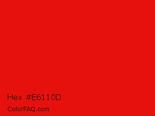Hex #e6110d Color is a normal red color and the nearest color is KU Crimson #e8000d. Hex code #e6110d and RGB value is rgb(230,17,13). In RGB color space, this color is composed of 90% red, 7% green, 5% blue, In CMYK color space, this color is composed of 0% cyan, 93% magenta, 94% yellow , 10% black , In HSL color space, this color has a hue angle of 1° , 89% saturation and 48% lightness.