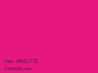 Hex #e6177e Color is a normal rose color and the nearest color is Vivid Cerise #da1d81. Hex code #e6177e and RGB value is rgb(230,23,126). In RGB color space, this color is composed of 90% red, 9% green, 49% blue, In CMYK color space, this color is composed of 0% cyan, 90% magenta, 45% yellow , 10% black , In HSL color space, this color has a hue angle of 330° , 82% saturation and 50% lightness.