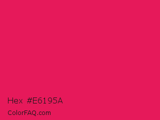 Hex #e6195a Color is a normal rose color and the nearest color is Ruby #e0115f. Hex code #e6195a and RGB value is rgb(230,25,90). In RGB color space, this color is composed of 90% red, 10% green, 35% blue, In CMYK color space, this color is composed of 0% cyan, 89% magenta, 61% yellow , 10% black , In HSL color space, this color has a hue angle of 341° , 80% saturation and 50% lightness.