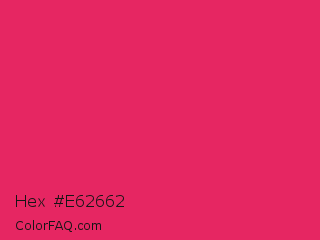 Hex #e62662 Color is a normal rose color and the nearest color is Razzmatazz #e3256b. Hex code #e62662 and RGB value is rgb(230,38,98). In RGB color space, this color is composed of 90% red, 15% green, 38% blue, In CMYK color space, this color is composed of 0% cyan, 83% magenta, 57% yellow , 10% black , In HSL color space, this color has a hue angle of 341° , 79% saturation and 53% lightness.