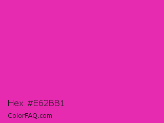 Hex #e62bb1 Color is a normal magenta color and the nearest color is Frostbite #e936a7. Hex code #e62bb1 and RGB value is rgb(230,43,177). In RGB color space, this color is composed of 90% red, 17% green, 69% blue, In CMYK color space, this color is composed of 0% cyan, 81% magenta, 23% yellow , 10% black , In HSL color space, this color has a hue angle of 317° , 79% saturation and 54% lightness.