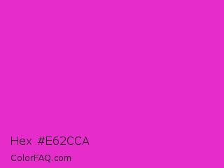 Hex #e62cca Color is a normal magenta color and the nearest color is Razzle Dazzle Rose #ff33cc. Hex code #e62cca and RGB value is rgb(230,44,202). In RGB color space, this color is composed of 90% red, 17% green, 79% blue, In CMYK color space, this color is composed of 0% cyan, 81% magenta, 12% yellow , 10% black , In HSL color space, this color has a hue angle of 309° , 79% saturation and 54% lightness.