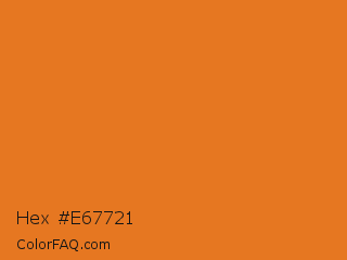 Hex #e67721 Color is a normal orange color and the nearest color is Tango #ed7a1c. Hex code #e67721 and RGB value is rgb(230,119,33). In RGB color space, this color is composed of 90% red, 47% green, 13% blue, In CMYK color space, this color is composed of 0% cyan, 48% magenta, 86% yellow , 10% black , In HSL color space, this color has a hue angle of 26° , 80% saturation and 52% lightness.