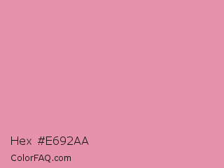 Hex #e692aa Color is a light rose color and the nearest color is Light Thulian Pink #e68fac. Hex code #e692aa and RGB value is rgb(230,146,170). In RGB color space, this color is composed of 90% red, 57% green, 67% blue, In CMYK color space, this color is composed of 0% cyan, 37% magenta, 26% yellow , 10% black , In HSL color space, this color has a hue angle of 343° , 63% saturation and 74% lightness.