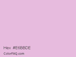 Hex #e6bbde Color is a very light magenta color and the nearest color is Melanie #e4c2d5. Hex code #e6bbde and RGB value is rgb(230,187,222). In RGB color space, this color is composed of 90% red, 73% green, 87% blue, In CMYK color space, this color is composed of 0% cyan, 19% magenta, 3% yellow , 10% black , In HSL color space, this color has a hue angle of 311° , 46% saturation and 82% lightness.