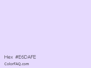 Hex #e6dafe Color is a very light indigo color and the nearest color is Lavender Mist #e6e6fa. Hex code #e6dafe and RGB value is rgb(230,218,254). In RGB color space, this color is composed of 90% red, 85% green, 100% blue, In CMYK color space, this color is composed of 9% cyan, 14% magenta, 0% yellow , 0% black , In HSL color space, this color has a hue angle of 260° , 95% saturation and 93% lightness.