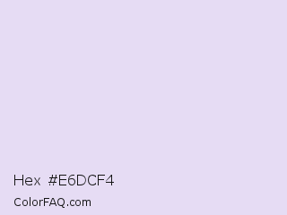 Hex #e6dcf4 Color is a very light violet color and the nearest color is Snuff #e2d8ed. Hex code #e6dcf4 and RGB value is rgb(230,220,244). In RGB color space, this color is composed of 90% red, 86% green, 96% blue, In CMYK color space, this color is composed of 6% cyan, 10% magenta, 0% yellow , 4% black , In HSL color space, this color has a hue angle of 265° , 52% saturation and 91% lightness.