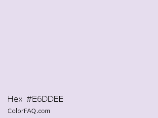 Hex #e6ddee Color is a very light purple color and the nearest color is Snuff #e2d8ed. Hex code #e6ddee and RGB value is rgb(230,221,238). In RGB color space, this color is composed of 90% red, 87% green, 93% blue, In CMYK color space, this color is composed of 3% cyan, 7% magenta, 0% yellow , 7% black , In HSL color space, this color has a hue angle of 272° , 33% saturation and 90% lightness.