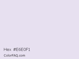 Hex #e6e0f1 Color is a very light violet color and the nearest color is Snuff #e2d8ed. Hex code #e6e0f1 and RGB value is rgb(230,224,241). In RGB color space, this color is composed of 90% red, 88% green, 95% blue, In CMYK color space, this color is composed of 5% cyan, 7% magenta, 0% yellow , 5% black , In HSL color space, this color has a hue angle of 261° , 38% saturation and 91% lightness.