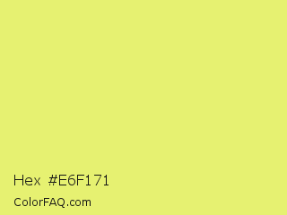 Hex #e6f171 Color is a light yellow color and the nearest color is Manz #eeef78. Hex code #e6f171 and RGB value is rgb(230,241,113). In RGB color space, this color is composed of 90% red, 95% green, 44% blue, In CMYK color space, this color is composed of 5% cyan, 0% magenta, 53% yellow , 5% black , In HSL color space, this color has a hue angle of 65° , 82% saturation and 69% lightness.