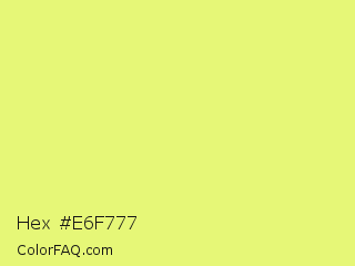 Hex #e6f777 Color is a light yellow color and the nearest color is Manz #eeef78. Hex code #e6f777 and RGB value is rgb(230,247,119). In RGB color space, this color is composed of 90% red, 97% green, 47% blue, In CMYK color space, this color is composed of 7% cyan, 0% magenta, 52% yellow , 3% black , In HSL color space, this color has a hue angle of 68° , 89% saturation and 72% lightness.