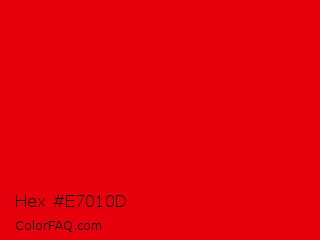 Hex #e7010d Color is a normal red color and the nearest color is KU Crimson #e8000d. Hex code #e7010d and RGB value is rgb(231,1,13). In RGB color space, this color is composed of 91% red, 0% green, 5% blue, In CMYK color space, this color is composed of 0% cyan, 100% magenta, 94% yellow , 9% black , In HSL color space, this color has a hue angle of 357° , 99% saturation and 45% lightness.