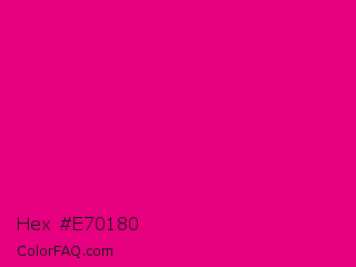 Hex #e70180 Color is a normal magenta color and the nearest color is Mexican Pink #e4007c. Hex code #e70180 and RGB value is rgb(231,1,128). In RGB color space, this color is composed of 91% red, 0% green, 50% blue, In CMYK color space, this color is composed of 0% cyan, 100% magenta, 45% yellow , 9% black , In HSL color space, this color has a hue angle of 327° , 99% saturation and 45% lightness.