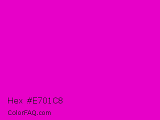 Hex #e701c8 Color is a normal magenta color and the nearest color is Purple Pizzazz #ff00cc. Hex code #e701c8 and RGB value is rgb(231,1,200). In RGB color space, this color is composed of 91% red, 0% green, 78% blue, In CMYK color space, this color is composed of 0% cyan, 100% magenta, 13% yellow , 9% black , In HSL color space, this color has a hue angle of 308° , 99% saturation and 45% lightness.