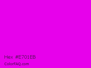 Hex #e701eb Color is a normal magenta color and the nearest color is Phlox #df00ff. Hex code #e701eb and RGB value is rgb(231,1,235). In RGB color space, this color is composed of 91% red, 0% green, 92% blue, In CMYK color space, this color is composed of 2% cyan, 100% magenta, 0% yellow , 8% black , In HSL color space, this color has a hue angle of 299° , 99% saturation and 46% lightness.