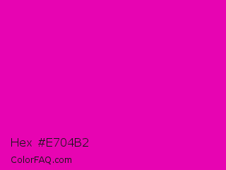 Hex #e704b2 Color is a normal magenta color and the nearest color is Hollywood Cerise #f400a1. Hex code #e704b2 and RGB value is rgb(231,4,178). In RGB color space, this color is composed of 91% red, 2% green, 70% blue, In CMYK color space, this color is composed of 0% cyan, 98% magenta, 23% yellow , 9% black , In HSL color space, this color has a hue angle of 314° , 97% saturation and 46% lightness.