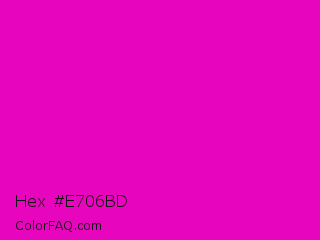 Hex #e706bd Color is a normal magenta color and the nearest color is Shocking Pink #fc0fc0. Hex code #e706bd and RGB value is rgb(231,6,189). In RGB color space, this color is composed of 91% red, 2% green, 74% blue, In CMYK color space, this color is composed of 0% cyan, 97% magenta, 18% yellow , 9% black , In HSL color space, this color has a hue angle of 311° , 95% saturation and 46% lightness.