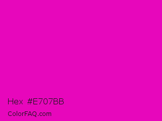 Hex #e707bb Color is a normal magenta color and the nearest color is Shocking Pink #fc0fc0. Hex code #e707bb and RGB value is rgb(231,7,187). In RGB color space, this color is composed of 91% red, 3% green, 73% blue, In CMYK color space, this color is composed of 0% cyan, 97% magenta, 19% yellow , 9% black , In HSL color space, this color has a hue angle of 312° , 94% saturation and 47% lightness.