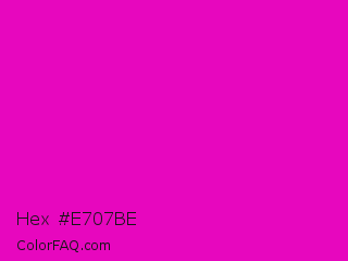 Hex #e707be Color is a normal magenta color and the nearest color is Shocking Pink #fc0fc0. Hex code #e707be and RGB value is rgb(231,7,190). In RGB color space, this color is composed of 91% red, 3% green, 75% blue, In CMYK color space, this color is composed of 0% cyan, 97% magenta, 18% yellow , 9% black , In HSL color space, this color has a hue angle of 311° , 94% saturation and 47% lightness.