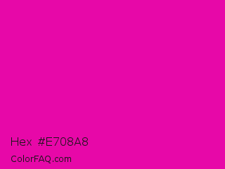 Hex #e708a8 Color is a normal magenta color and the nearest color is Hollywood Cerise #f400a1. Hex code #e708a8 and RGB value is rgb(231,8,168). In RGB color space, this color is composed of 91% red, 3% green, 66% blue, In CMYK color space, this color is composed of 0% cyan, 97% magenta, 27% yellow , 9% black , In HSL color space, this color has a hue angle of 317° , 93% saturation and 47% lightness.