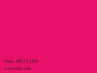 Hex #e7116a Color is a normal rose color and the nearest color is Ruby #e0115f. Hex code #e7116a and RGB value is rgb(231,17,106). In RGB color space, this color is composed of 91% red, 7% green, 42% blue, In CMYK color space, this color is composed of 0% cyan, 93% magenta, 54% yellow , 9% black , In HSL color space, this color has a hue angle of 335° , 86% saturation and 49% lightness.