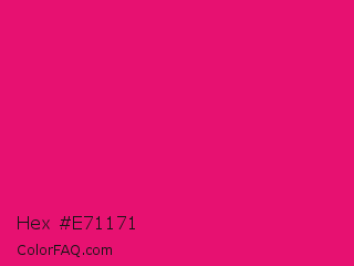 Hex #e71171 Color is a normal rose color and the nearest color is Red Purple #e40078. Hex code #e71171 and RGB value is rgb(231,17,113). In RGB color space, this color is composed of 91% red, 7% green, 44% blue, In CMYK color space, this color is composed of 0% cyan, 93% magenta, 51% yellow , 9% black , In HSL color space, this color has a hue angle of 333° , 86% saturation and 49% lightness.