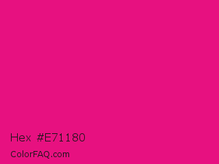 Hex #e71180 Color is a normal rose color and the nearest color is Mexican Pink #e4007c. Hex code #e71180 and RGB value is rgb(231,17,128). In RGB color space, this color is composed of 91% red, 7% green, 50% blue, In CMYK color space, this color is composed of 0% cyan, 93% magenta, 45% yellow , 9% black , In HSL color space, this color has a hue angle of 329° , 86% saturation and 49% lightness.