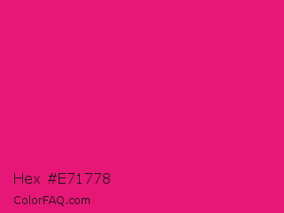 Hex #e71778 Color is a normal rose color and the nearest color is Vivid Cerise #da1d81. Hex code #e71778 and RGB value is rgb(231,23,120). In RGB color space, this color is composed of 91% red, 9% green, 47% blue, In CMYK color space, this color is composed of 0% cyan, 90% magenta, 48% yellow , 9% black , In HSL color space, this color has a hue angle of 332° , 82% saturation and 50% lightness.