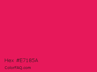 Hex #e7185a Color is a normal rose color and the nearest color is Ruby #e0115f. Hex code #e7185a and RGB value is rgb(231,24,90). In RGB color space, this color is composed of 91% red, 9% green, 35% blue, In CMYK color space, this color is composed of 0% cyan, 90% magenta, 61% yellow , 9% black , In HSL color space, this color has a hue angle of 341° , 81% saturation and 50% lightness.