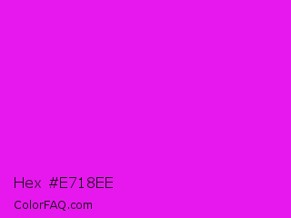 Hex #e718ee Color is a normal magenta color and the nearest color is Phlox #df00ff. Hex code #e718ee and RGB value is rgb(231,24,238). In RGB color space, this color is composed of 91% red, 9% green, 93% blue, In CMYK color space, this color is composed of 3% cyan, 90% magenta, 0% yellow , 7% black , In HSL color space, this color has a hue angle of 298° , 86% saturation and 51% lightness.