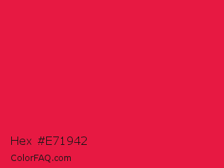 Hex #e71942 Color is a normal red color and the nearest color is Spanish Crimson #e51a4c. Hex code #e71942 and RGB value is rgb(231,25,66). In RGB color space, this color is composed of 91% red, 10% green, 26% blue, In CMYK color space, this color is composed of 0% cyan, 89% magenta, 71% yellow , 9% black , In HSL color space, this color has a hue angle of 348° , 81% saturation and 50% lightness.