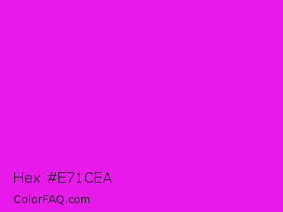Hex #e71cea Color is a normal magenta color and the nearest color is Phlox #df00ff. Hex code #e71cea and RGB value is rgb(231,28,234). In RGB color space, this color is composed of 91% red, 11% green, 92% blue, In CMYK color space, this color is composed of 1% cyan, 88% magenta, 0% yellow , 8% black , In HSL color space, this color has a hue angle of 299° , 83% saturation and 51% lightness.
