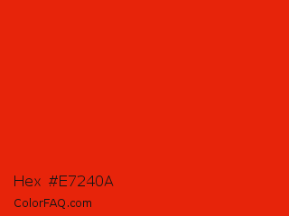 Hex #e7240a Color is a normal red color and the nearest color is Lust #e62020. Hex code #e7240a and RGB value is rgb(231,36,10). In RGB color space, this color is composed of 91% red, 14% green, 4% blue, In CMYK color space, this color is composed of 0% cyan, 84% magenta, 96% yellow , 9% black , In HSL color space, this color has a hue angle of 7° , 92% saturation and 47% lightness.