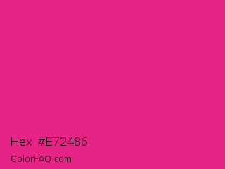 Hex #e72486 Color is a normal rose color and the nearest color is Barbie Pink #e0218a. Hex code #e72486 and RGB value is rgb(231,36,134). In RGB color space, this color is composed of 91% red, 14% green, 53% blue, In CMYK color space, this color is composed of 0% cyan, 84% magenta, 42% yellow , 9% black , In HSL color space, this color has a hue angle of 330° , 80% saturation and 52% lightness.