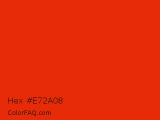 Hex #e72a08 Color is a normal red color and the nearest color is Red RYB #fe2712. Hex code #e72a08 and RGB value is rgb(231,42,8). In RGB color space, this color is composed of 91% red, 16% green, 3% blue, In CMYK color space, this color is composed of 0% cyan, 82% magenta, 97% yellow , 9% black , In HSL color space, this color has a hue angle of 9° , 93% saturation and 47% lightness.