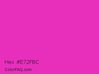 Hex #e72fbc Color is a normal magenta color and the nearest color is Frostbite #e936a7. Hex code #e72fbc and RGB value is rgb(231,47,188). In RGB color space, this color is composed of 91% red, 18% green, 74% blue, In CMYK color space, this color is composed of 0% cyan, 80% magenta, 19% yellow , 9% black , In HSL color space, this color has a hue angle of 314° , 79% saturation and 55% lightness.