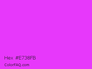 Hex #e738fb Color is a normal magenta color and the nearest color is Purple Pizzazz #fe4eda. Hex code #e738fb and RGB value is rgb(231,56,251). In RGB color space, this color is composed of 91% red, 22% green, 98% blue, In CMYK color space, this color is composed of 8% cyan, 78% magenta, 0% yellow , 2% black , In HSL color space, this color has a hue angle of 294° , 96% saturation and 60% lightness.
