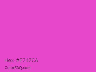 Hex #e747ca Color is a normal magenta color and the nearest color is Purple Pizzazz #fe4eda. Hex code #e747ca and RGB value is rgb(231,71,202). In RGB color space, this color is composed of 91% red, 28% green, 79% blue, In CMYK color space, this color is composed of 0% cyan, 69% magenta, 13% yellow , 9% black , In HSL color space, this color has a hue angle of 311° , 77% saturation and 59% lightness.