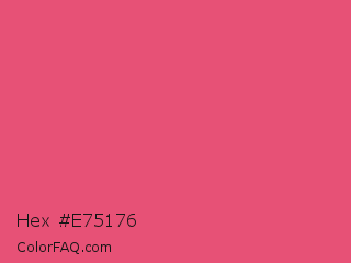Hex #e75176 Color is a light red color and the nearest color is Dark Pink #e75480. Hex code #e75176 and RGB value is rgb(231,81,118). In RGB color space, this color is composed of 91% red, 32% green, 46% blue, In CMYK color space, this color is composed of 0% cyan, 65% magenta, 49% yellow , 9% black , In HSL color space, this color has a hue angle of 345° , 76% saturation and 61% lightness.