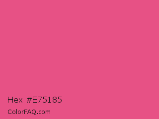 Hex #e75185 Color is a light rose color and the nearest color is Dark Pink #e75480. Hex code #e75185 and RGB value is rgb(231,81,133). In RGB color space, this color is composed of 91% red, 32% green, 52% blue, In CMYK color space, this color is composed of 0% cyan, 65% magenta, 42% yellow , 9% black , In HSL color space, this color has a hue angle of 339° , 76% saturation and 61% lightness.